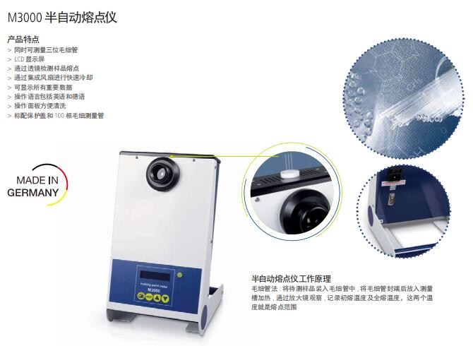 M3000半自動熔點儀是采用毛細管法:將待測樣品裝入毛細管中 將毛細管封端后放入測量槽加熱 通過放大鏡觀察 記錄初熔溫度及全熔溫度,這兩個溫度就是熔點范圍。